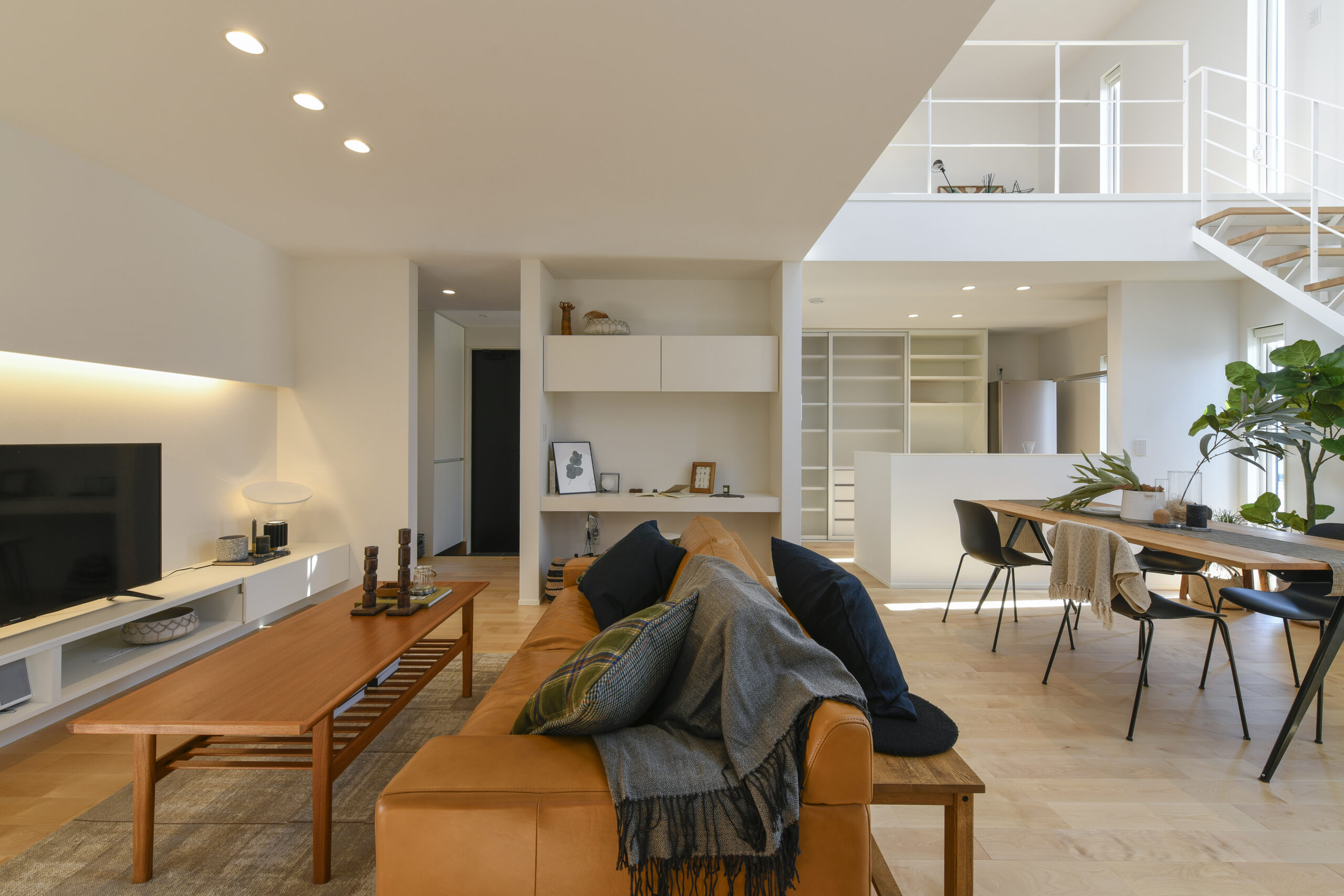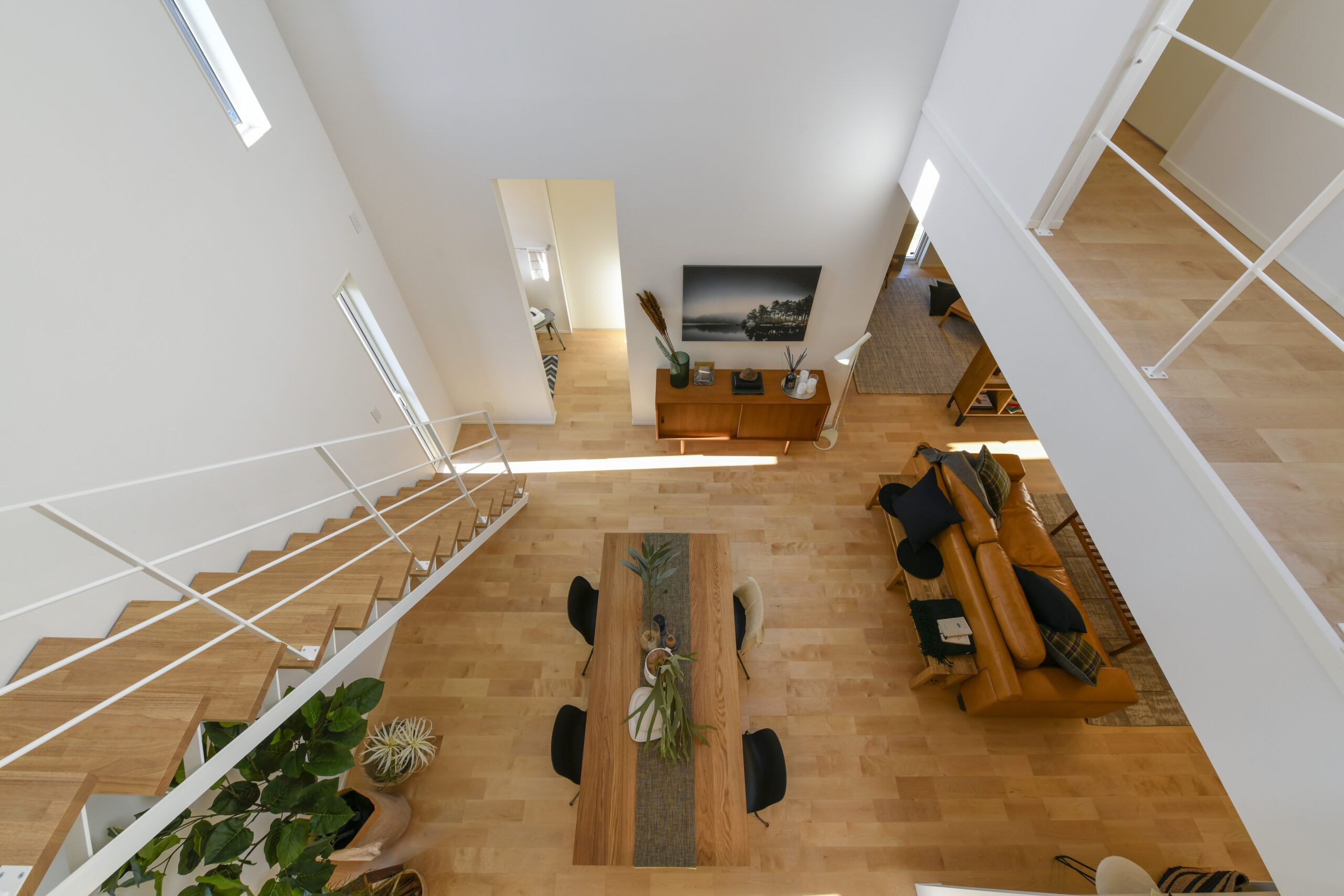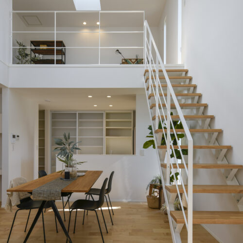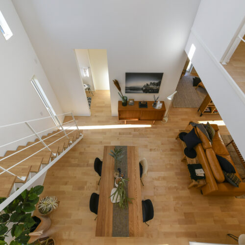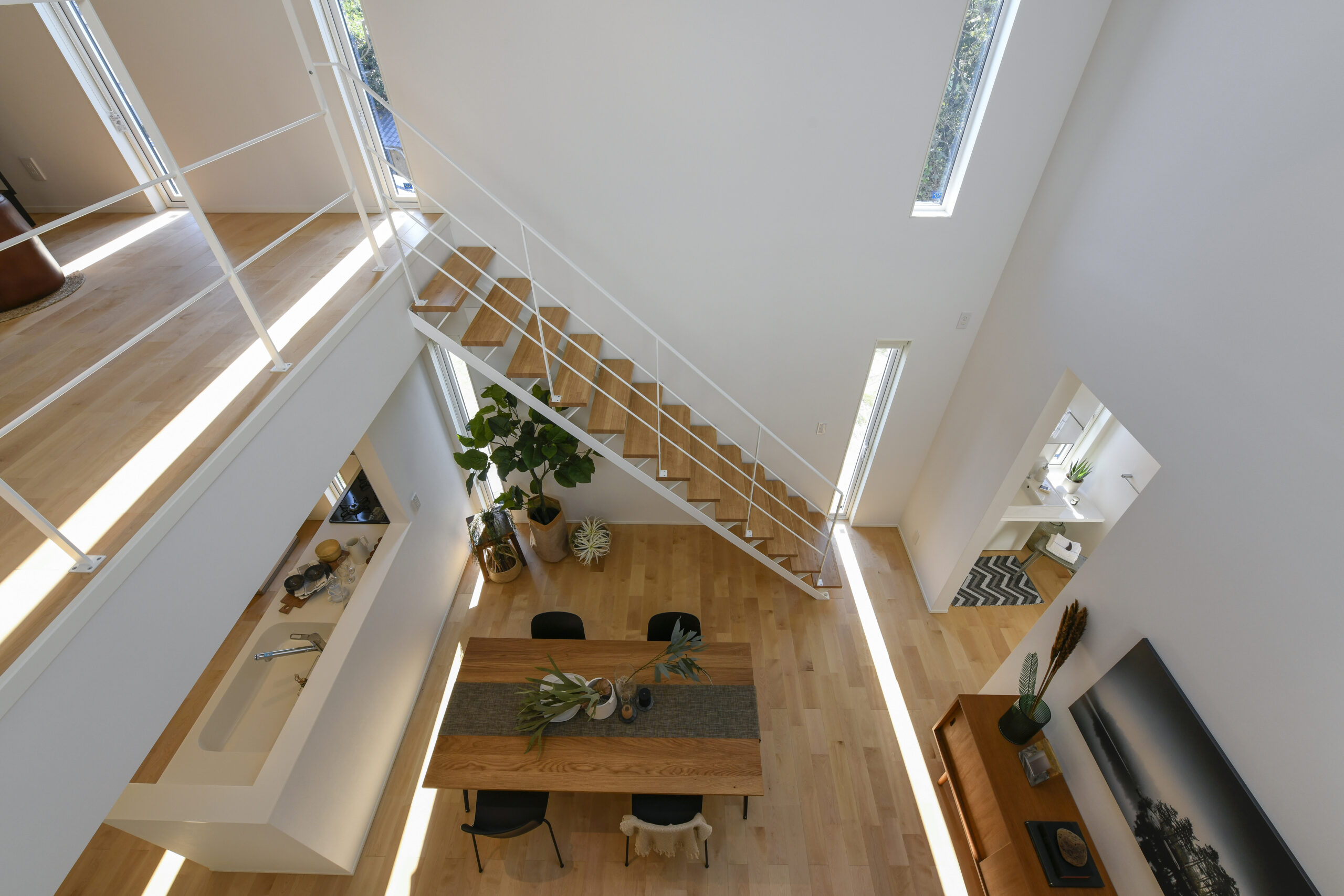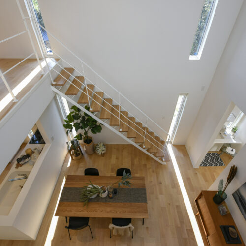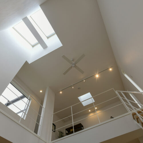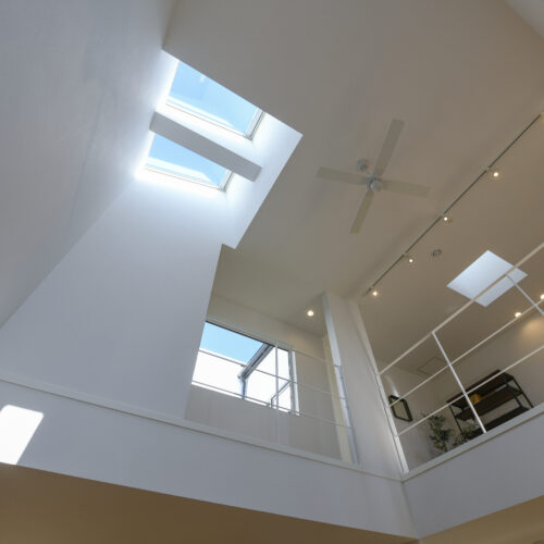 白を基調にした室内は、仕切りや凹凸を極力なくし、どんなインテリアでも合わせやすく、自由な家具配置が可能になります。吹き抜けと天窓によって、伸びやかな空間の広がりも感じられます。