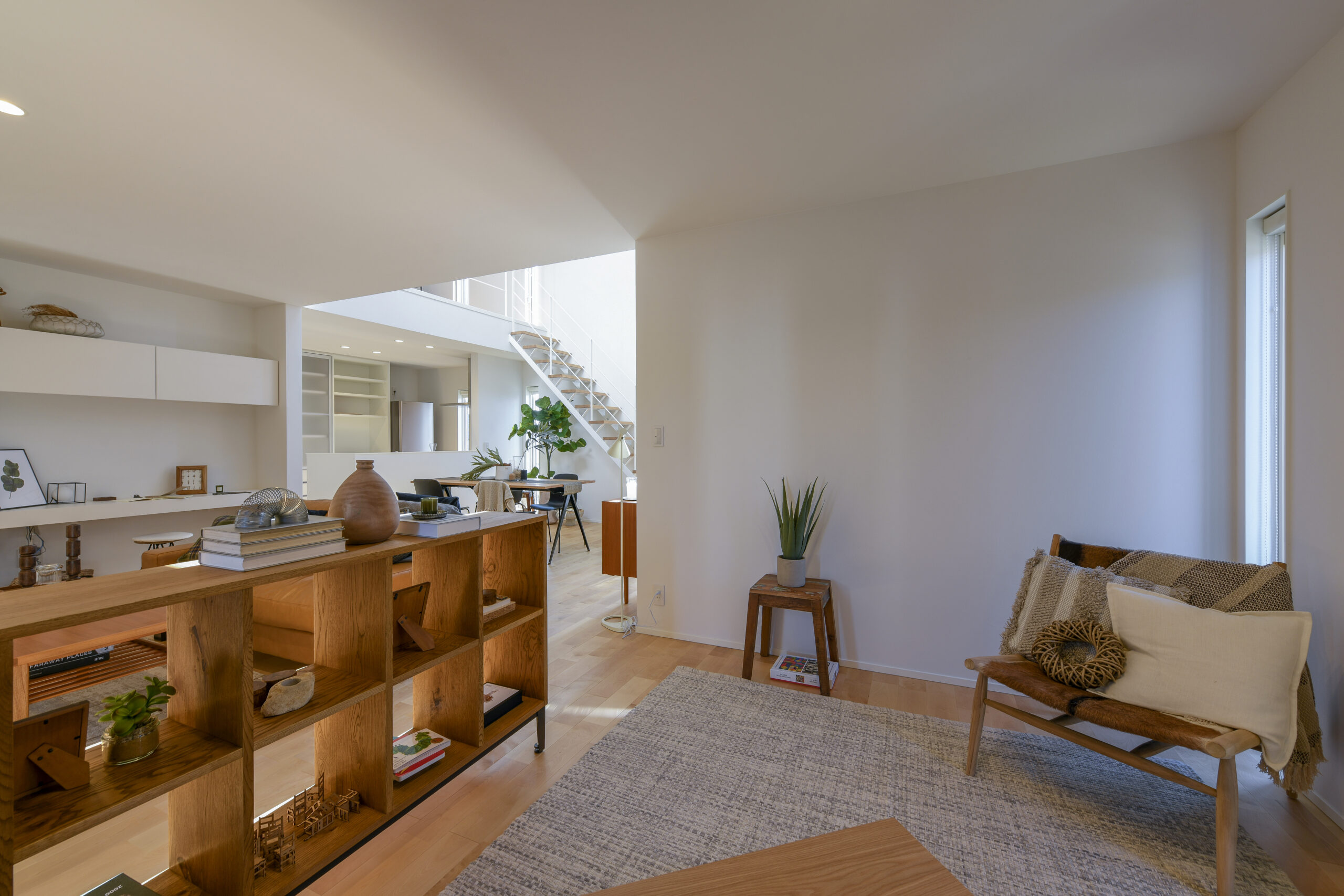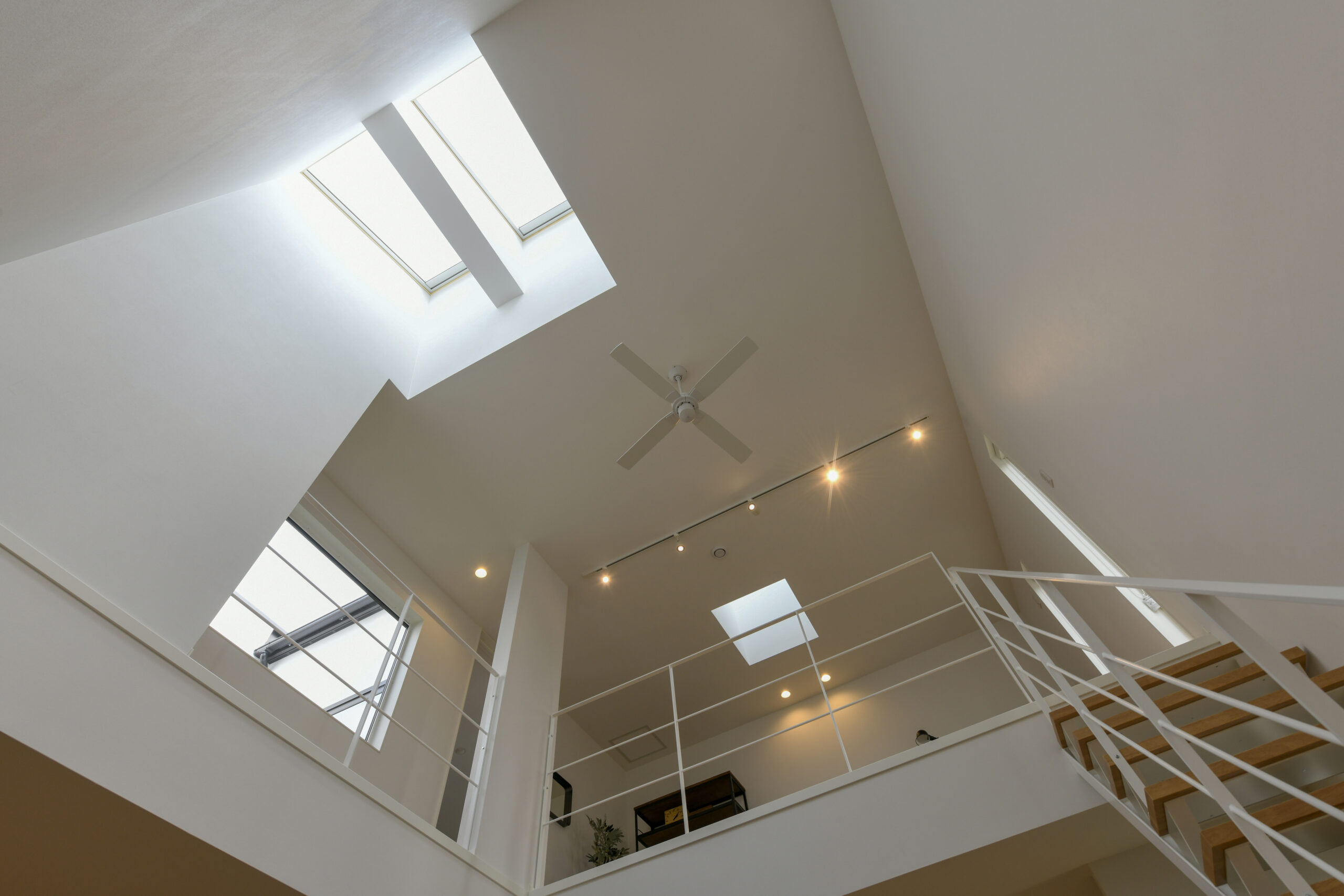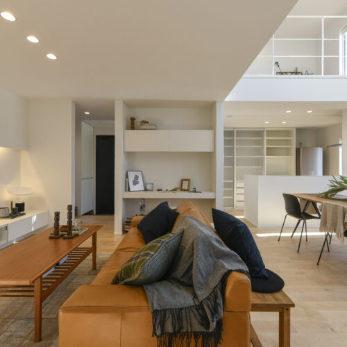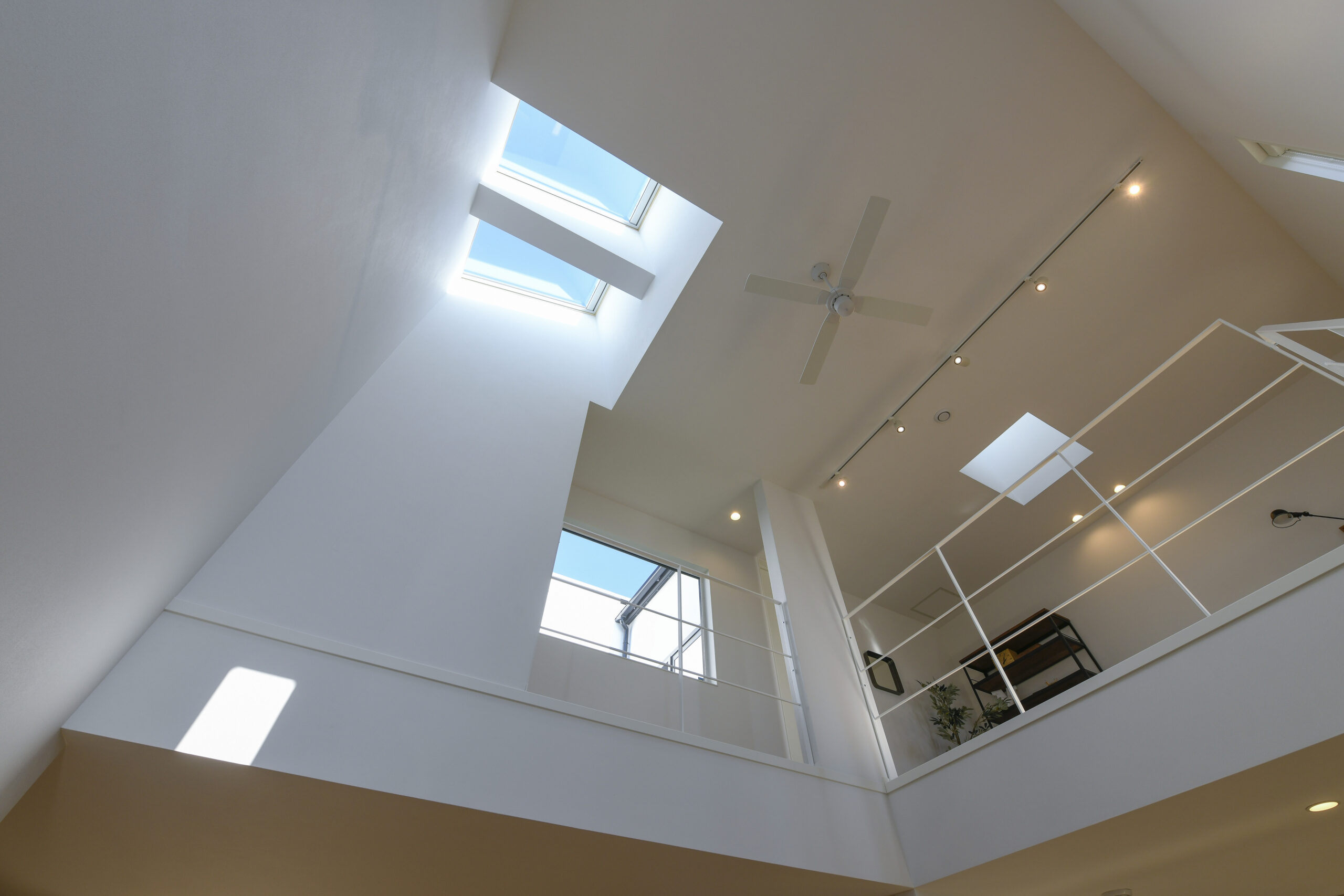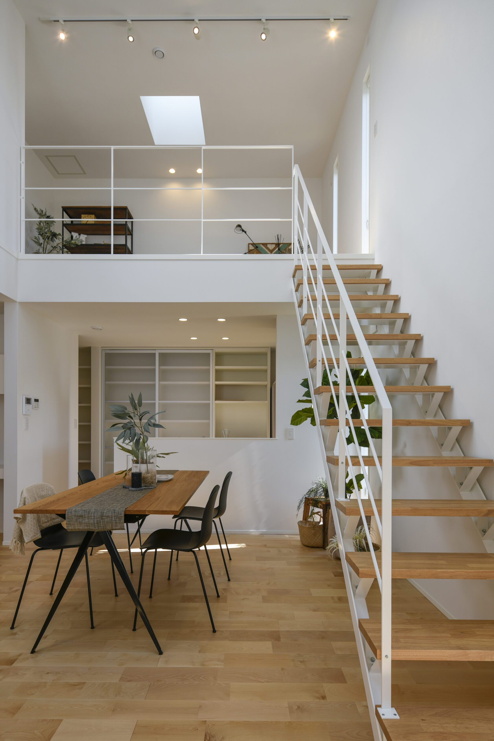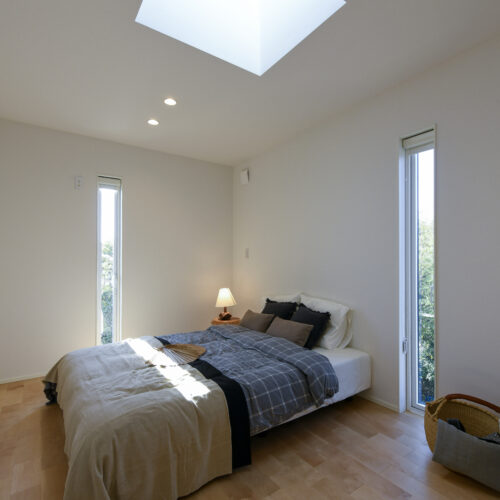 白を基調にした室内は、仕切りや凹凸を極力なくし、どんなインテリアでも合わせやすく、自由な家具配置が可能になります。吹き抜けと天窓によって、伸びやかな空間の広がりも感じられます。