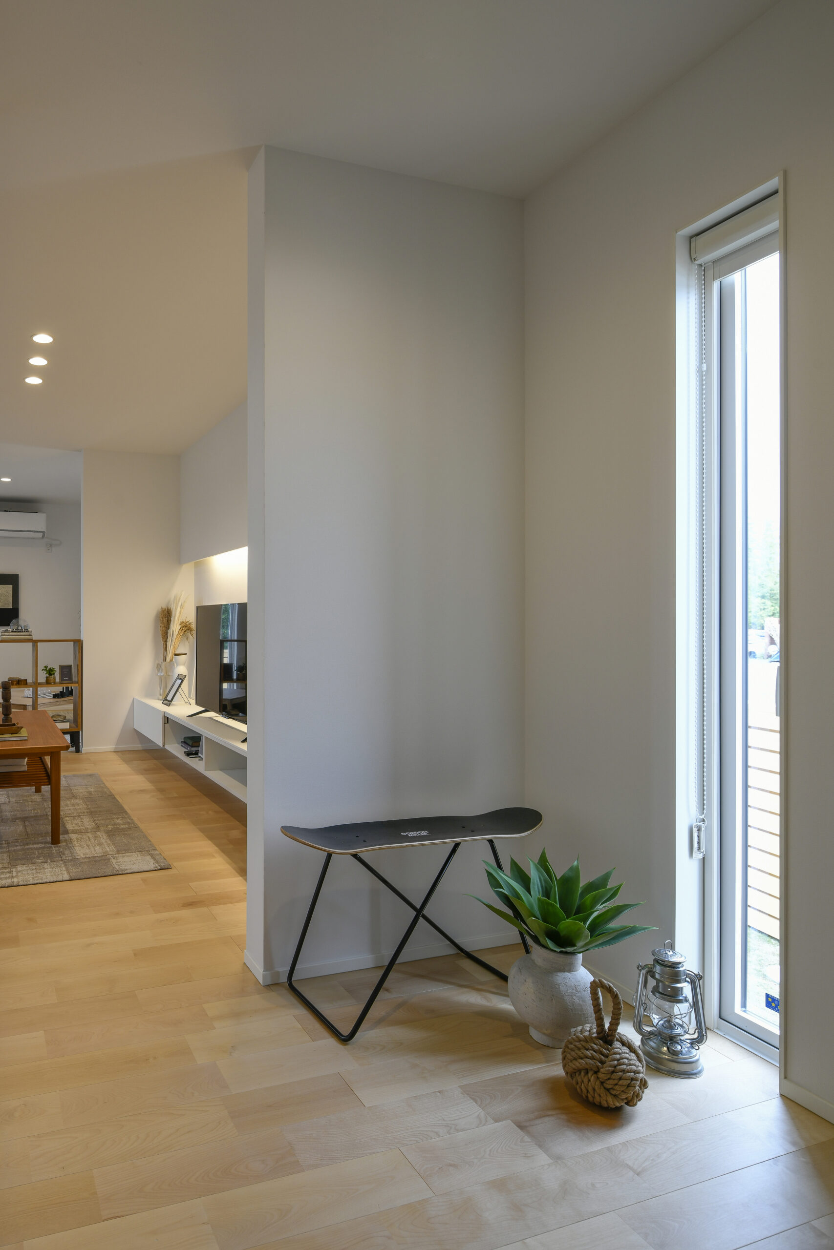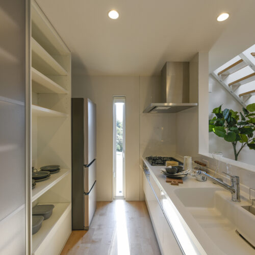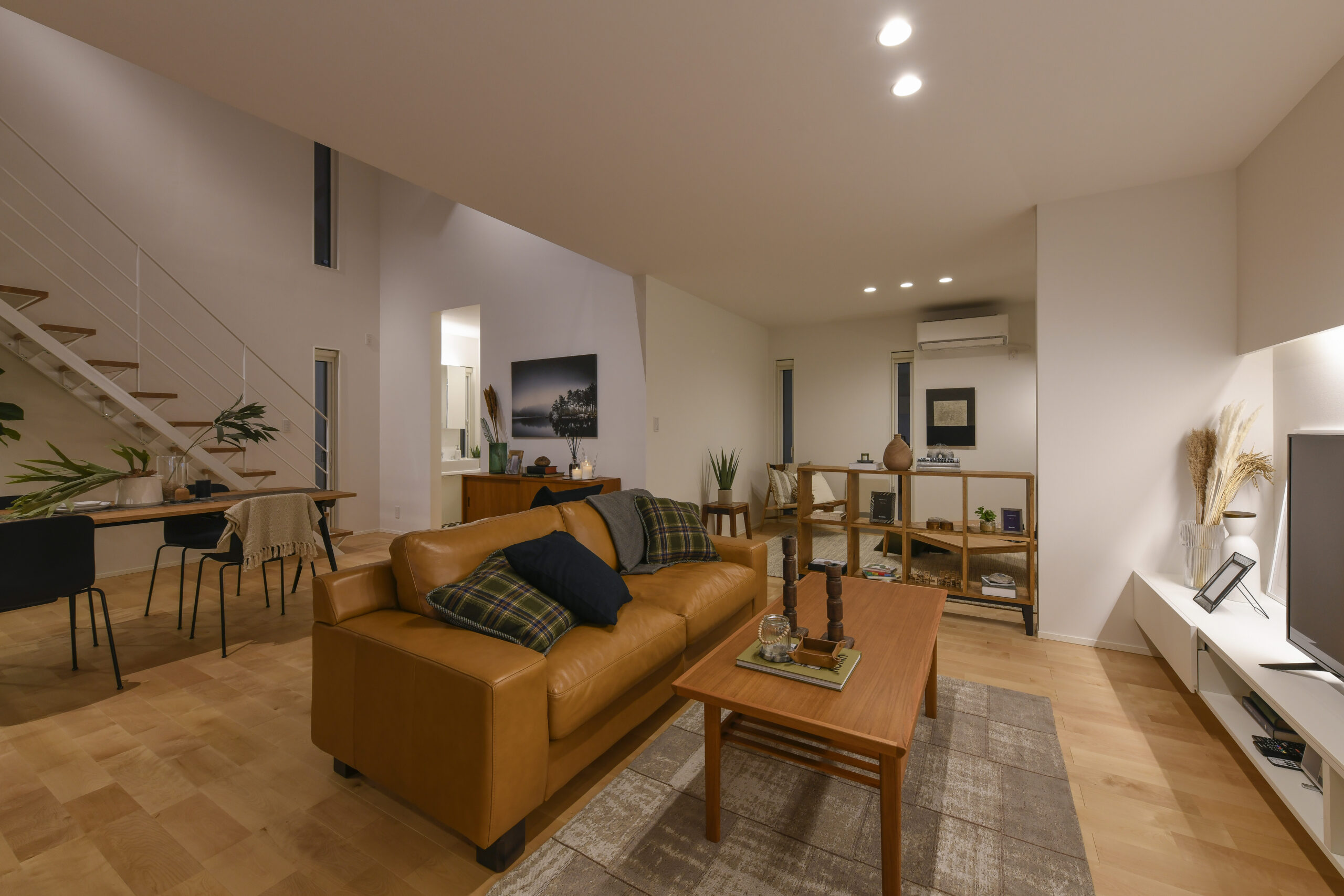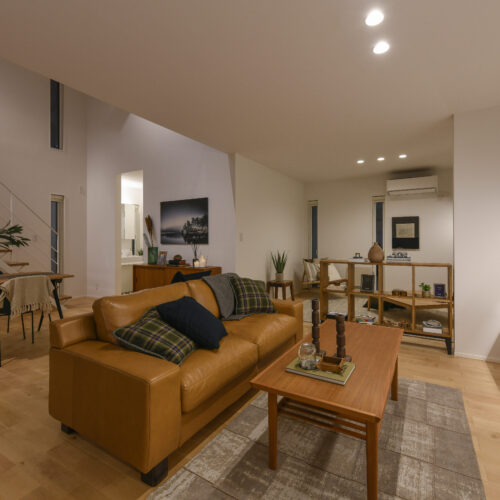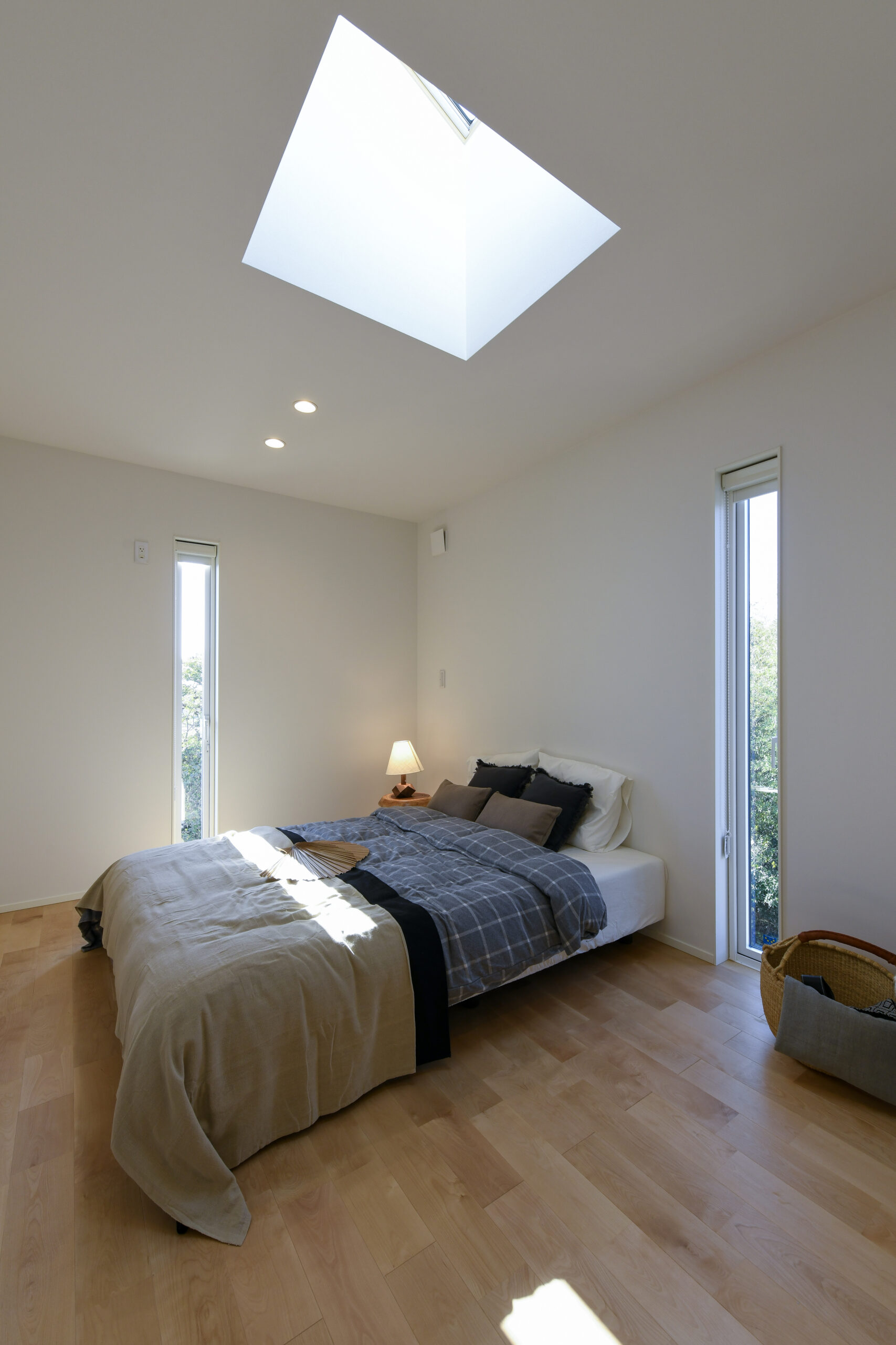 白を基調にした室内は、仕切りや凹凸を極力なくし、どんなインテリアでも合わせやすく、自由な家具配置が可能になります。吹き抜けと天窓によって、伸びやかな空間の広がりも感じられます。