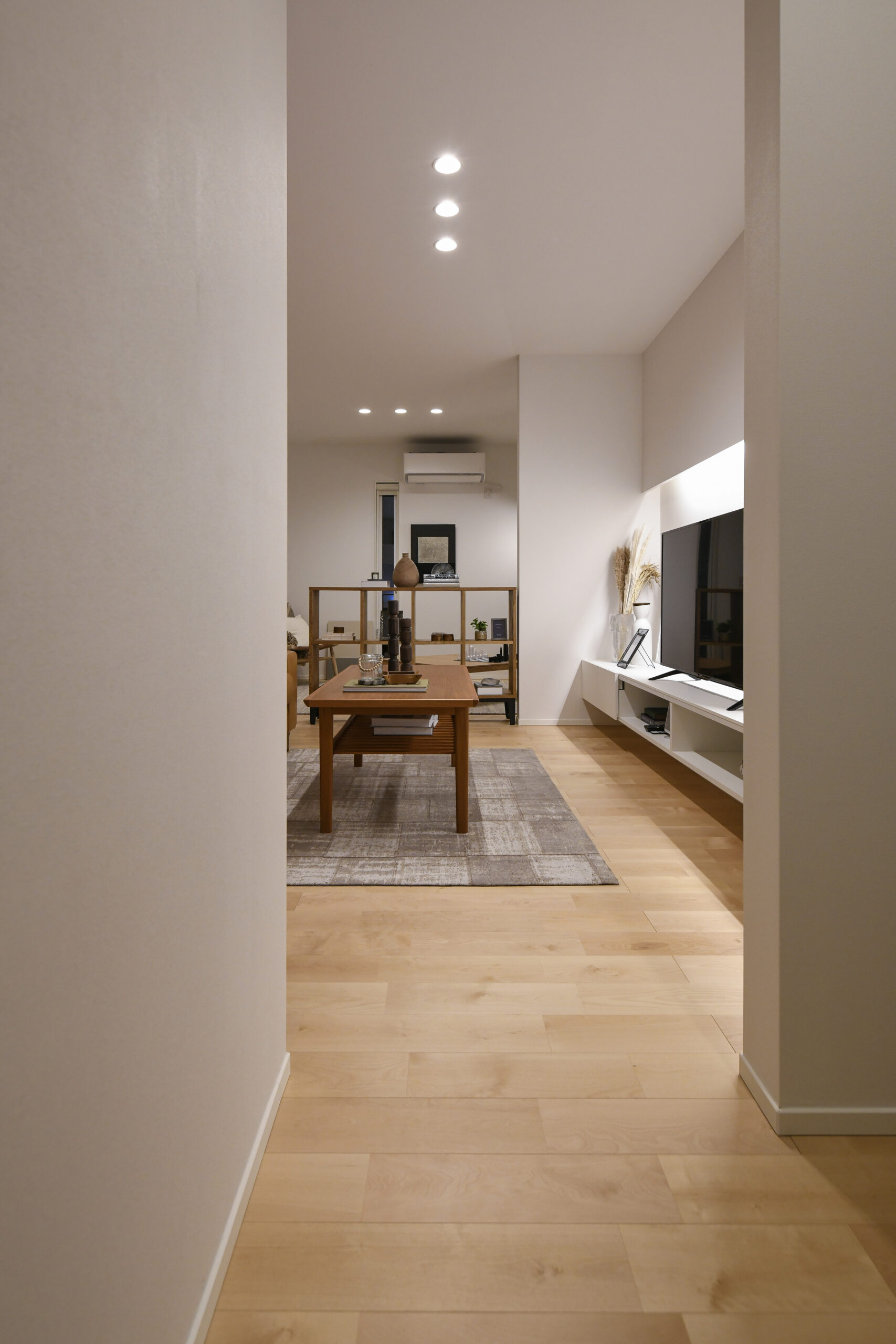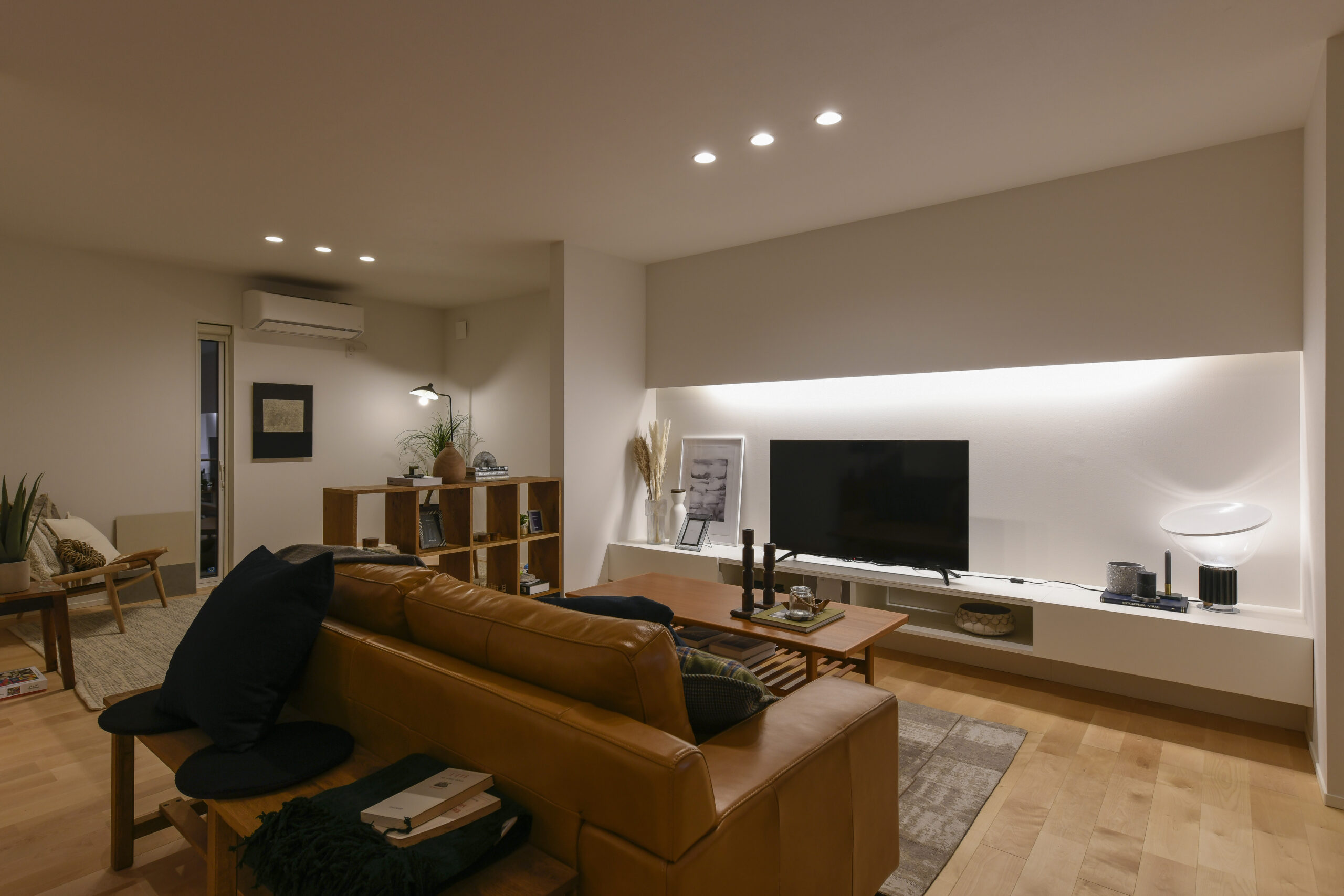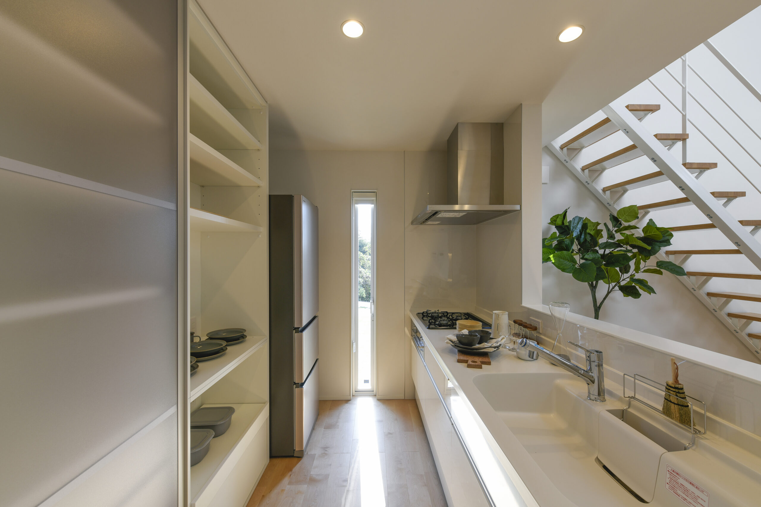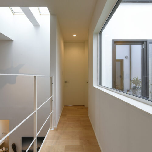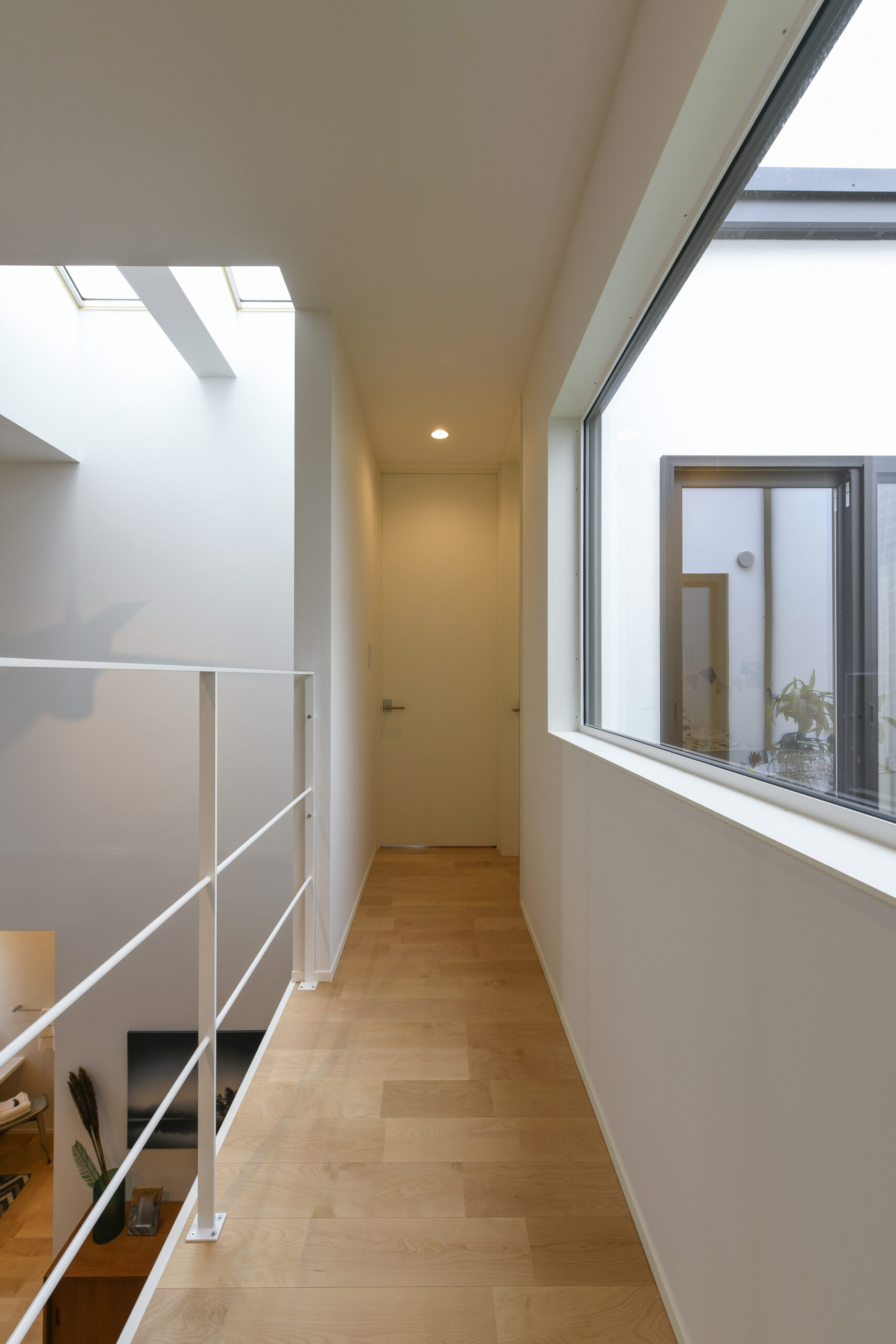白を基調にした室内は、仕切りや凹凸を極力なくし、どんなインテリアでも合わせやすく、自由な家具配置が可能になります。吹き抜けと天窓によって、伸びやかな空間の広がりも感じられます。