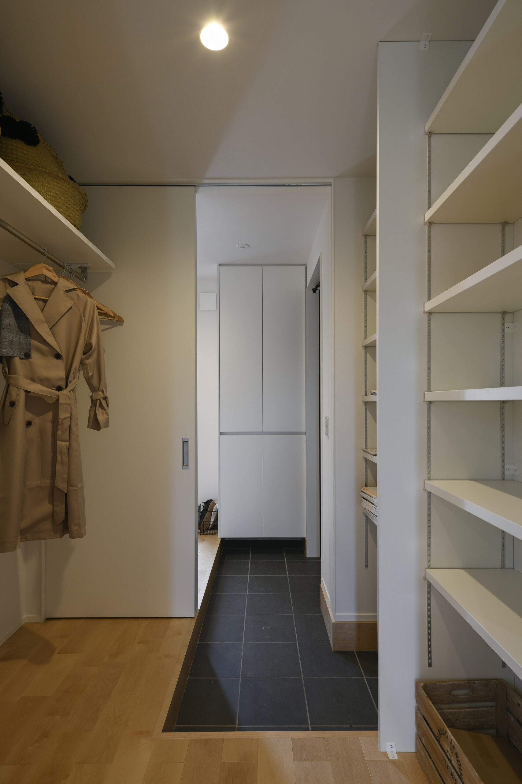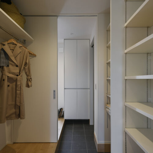 玄関から、SC&ウォークスルークローゼットを抜けキッチンにアクセスできる家事ラク動線を採用。