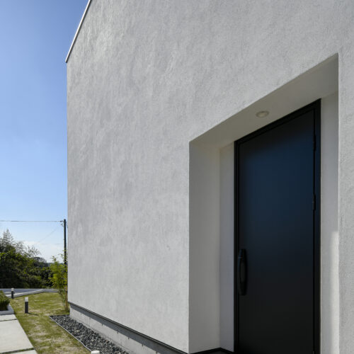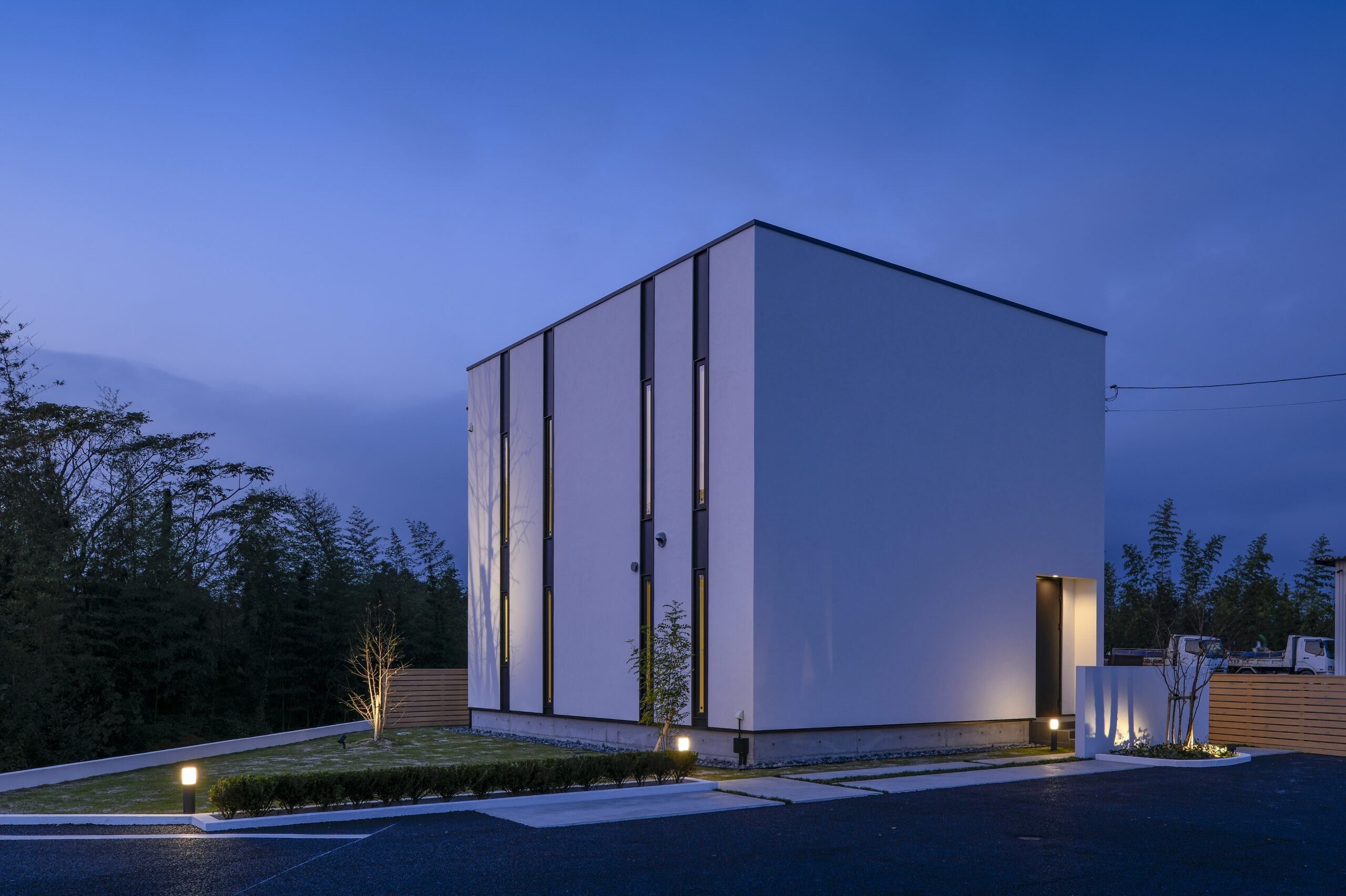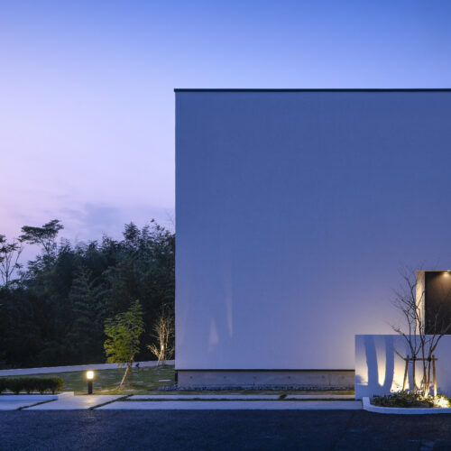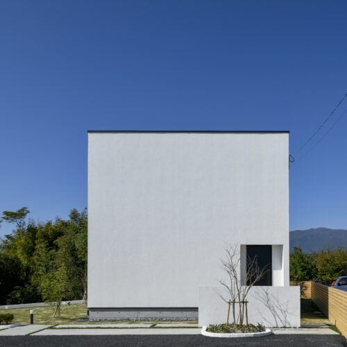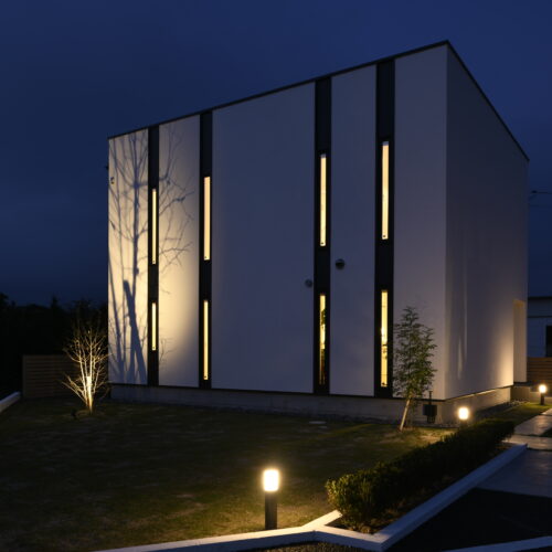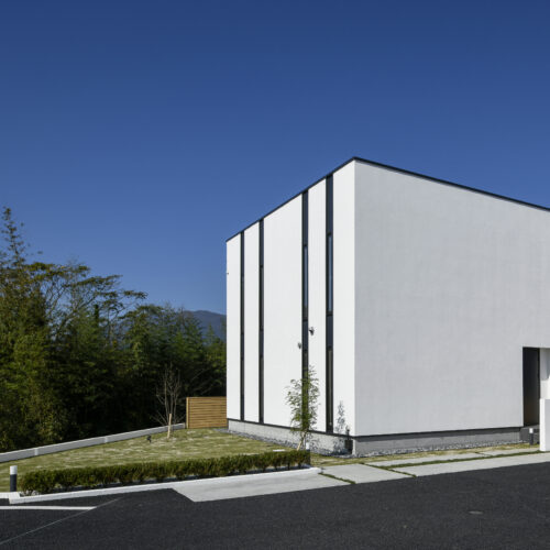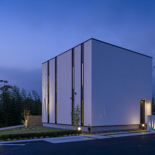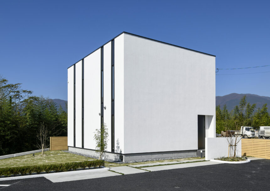 規格住宅product casaのアイコン的存在として支持されている〈 casa cube 〉の常設展示場。どんな場所に建っていても、その佇まいは凛として、シンプルで美しい四角い家。ファサードには窓がなく、建物側面にあるスリット窓が特徴的。その細い窓からは周囲の視線をシャットアウトしながら、自然の景色や風を心地よく取り入れます。