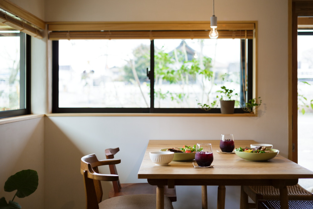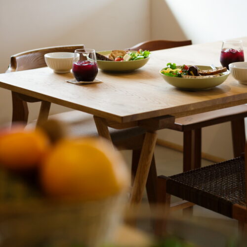 高さや使い勝手、質感を味わっていただくためにできた空間では、日々の暮らしの提案をより豊かにするためにスタッフが毎日使い、勉強の場となっています。MOKUの由来はさほらぼのユニークなスタッフたちが「モクモク食べ、モクモク話して、モクモクと考える」と「木」いうことから「MOKU」となりました。