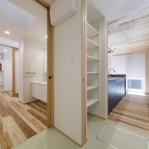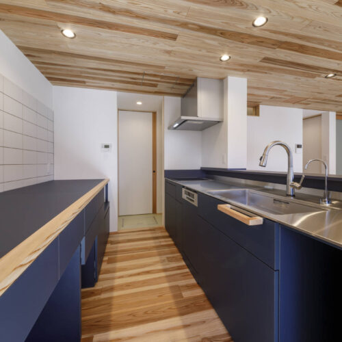 この住宅の床のフローリングは杉材(屋久島地杉)で施工してあります。杉材は傷つきやすいデメリットはありますが触れたときの感触や温かみはシート系のフローリングに比べて全然違います。造作枠や外壁、天井など各所に杉材を使用しています。キッチン、洗面化粧台に至るまで造作にこだわり家事を考慮した動線計画となっています。この住宅は自邸でもありますので見学されたい方は是非お声掛けください。