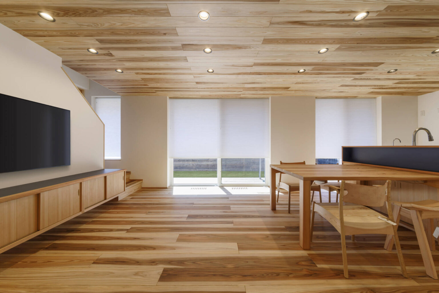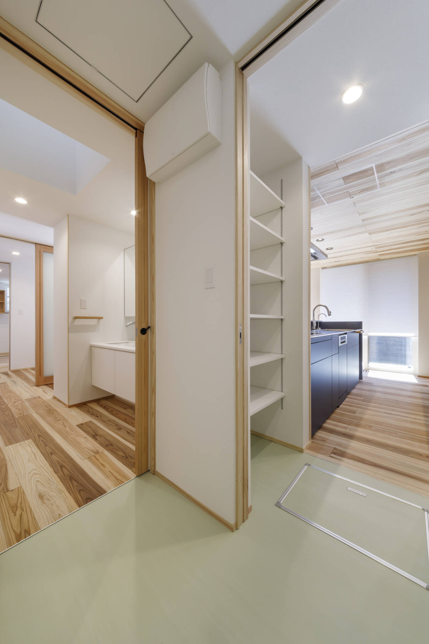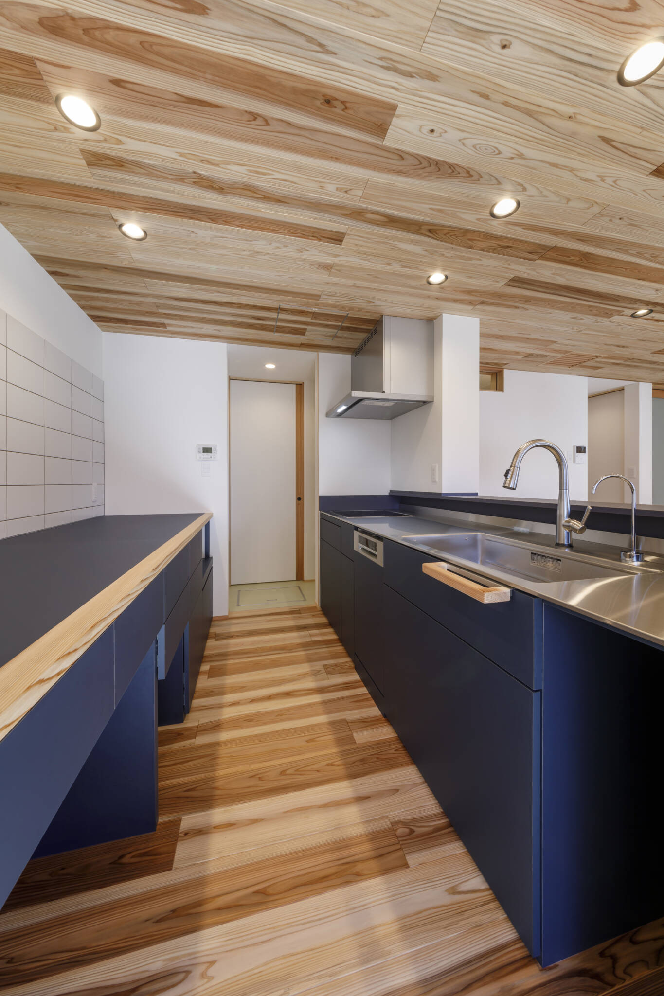 この住宅の床のフローリングは杉材(屋久島地杉)で施工してあります。杉材は傷つきやすいデメリットはありますが触れたときの感触や温かみはシート系のフローリングに比べて全然違います。造作枠や外壁、天井など各所に杉材を使用しています。キッチン、洗面化粧台に至るまで造作にこだわり家事を考慮した動線計画となっています。この住宅は自邸でもありますので見学されたい方は是非お声掛けください。