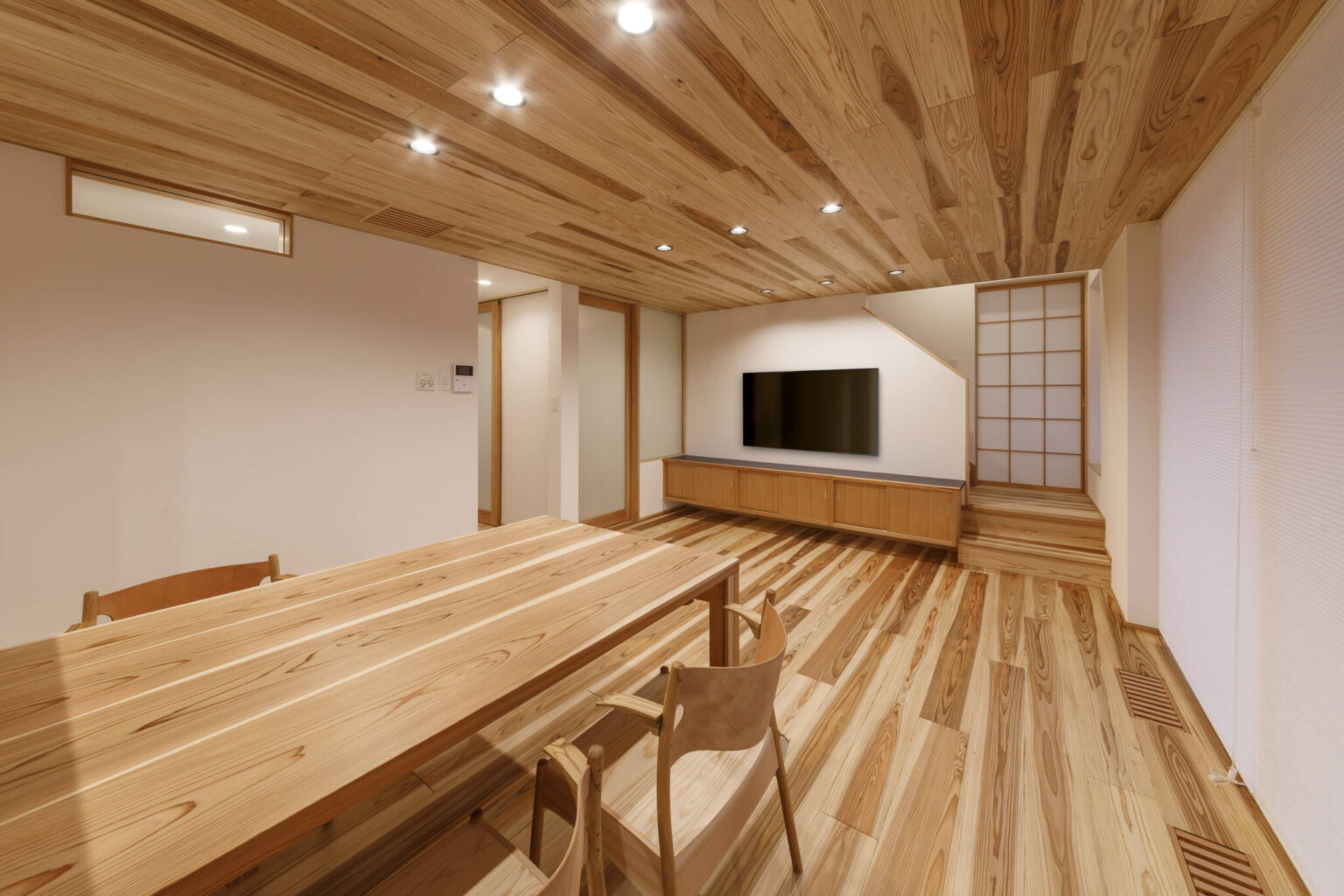 性能としては耐震等級3(許容応力度計算による)、断熱等級6(UA値=0.37W/㎡・K C値=0.5c㎡/㎡)となっています。また、床下エアコン、小屋裏エアコンを搭載し、第1種換気(全熱交換)による換気設備を設置しております。