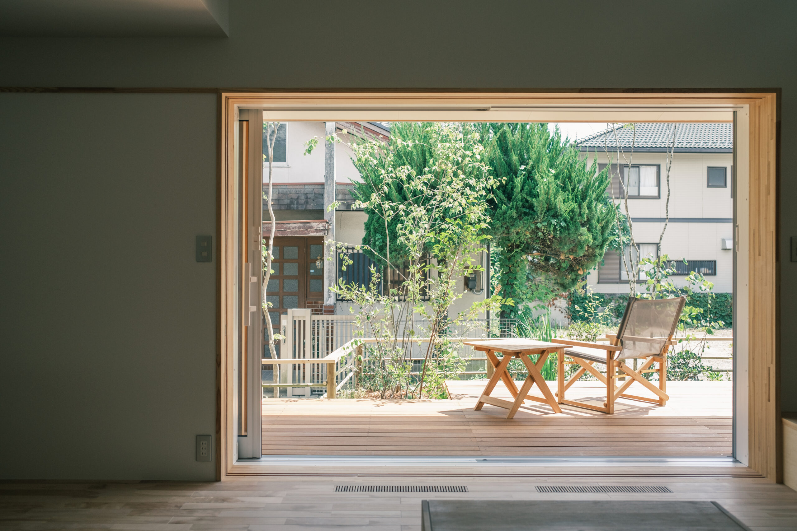 フルオープンにできるリビングのサッシは、LDKとウッドデッキをフラットにつなげ、庭との一体感が心地よい開放感を生み出します。